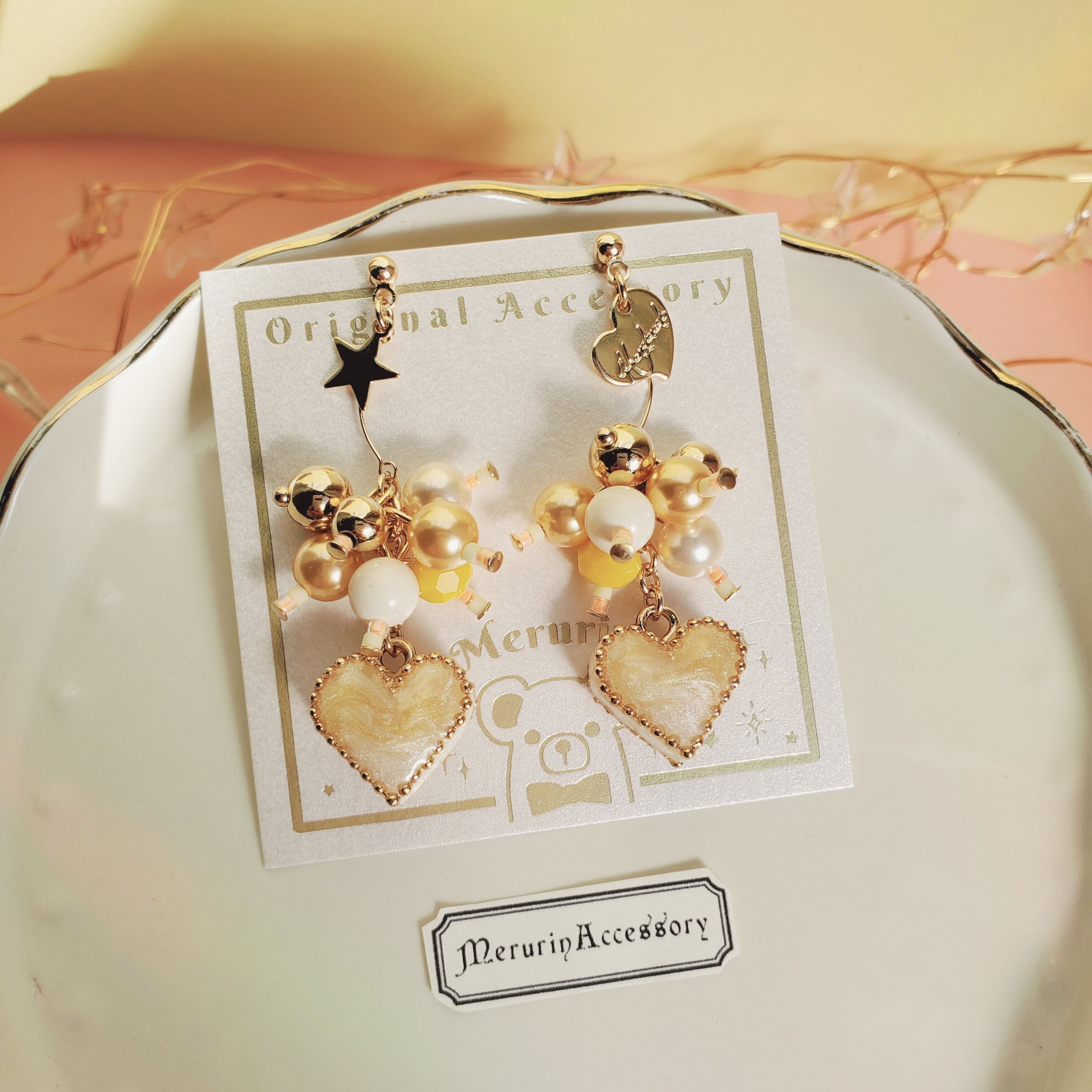 イエローとホワイトに色付くグラデーションハートと、パールがジャラジャラと揺れるピアスイヤリング(金具選べます)